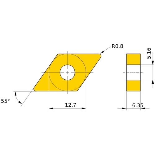 เม็ดมีดเกรด M, เหล็ก, ชนิด P, เม็ดมีด ISO, แบบบวก, เพชร 35°, การตัดเบา, มีรู, มุมบวก 7°, MC6135