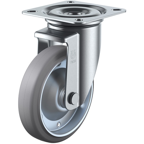 ลูกล้อหมุนแบบจาน ยางสีเทา เส้นผ่านศูนย์กลางล้อ 130 มม. แบบ PM แบบ PMS ขนาดการติดตั้ง 90 x 90 (80 x 80)