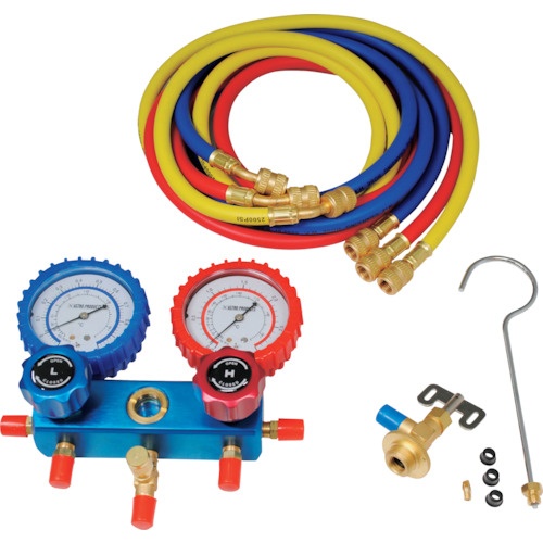 เกจแมนิโฟลด์ เป็นอุปกรณ์วัดแรงดันที่ใช้ในการตรวจสอบและควบคุมระบบสารทำความเย็น เช่น ระบบแอร์รถยนต์ เครื่องปรับอากาศ หรือระบบทำความเย็นเชิงพาณิชย์ ใช้งานหลักคือวัดแรงดันในระบบแอร์ เติมหรือดูดน้ำยาทำความเย็น ตรวจสอบสมรรถนะระบบ รวมถึงไล่อากาศหรือดูดสูญญากาศก่อนเติมน้ำยา มีลักษณะเป็นแผงควบคุมที่มีเกจวัดแรงดันติดอยู่ 2 ตัวหรือมากกว่า พร้อมวาล์วควบคุมและท่อสายต่อที่สามารถเชื่อมกับคอมเพรสเซอร์หรือแหล่งจ่ายน้ำยาได้ เกจแมนิโฟลด์ทำจากโลหะผสมแข็งแรง เช่น ทองเหลือง อลูมิเนียม หรือเหล็ก เพื่อทนแรงดันสูง พร้อมหน้าปัดกระจกหรือพลาสติกใสสำหรับแสดงค่าแรงดันอย่างแม่นยำ เหมาะสำหรับช่างแอร์ วิศวกรระบบทำความเย็น และผู้ดูแลบำรุงรักษาระบบปรับอากาศในบ้านหรืออุตสาหกรรม