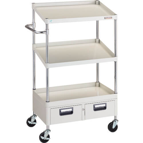 เนื่องจากการเคลือบผงต้านเชื้อแบคทีเรียจึงใช้งานได้อย่างสะอาดเป็นเวลานาน (SIAA antibacterial ISO22196: JP0122258A0002X) ชั้นวางเอียง (12° สำหรับความลึก 500 มม. 10° สำหรับความลึก 600 มม.) จึงเหมาะสำหรับงานที่ต้องขนของขึ้นและลงบ่อยๆ สามารถใช้ชั้นวางได้ทั้งด้านหน้าและด้านหลัง และใช้บูชแบบสัมผัสเดียวเพื่อการประกอบที่ง่ายดาย เป็นเกวียนแบบท่อที่ใช้ล้อลดเสียงรบกวนและใช้งานได้เงียบและราบรื่น