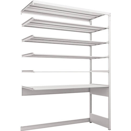 ส่วนด้านล่างแบบเปิดสามารถใช้เป็นพื้นที่ติดตั้งเกวียนและรถเข็นได้ แป้งเคลือบสารต้านแบคทีเรียช่วยรักษาความสะอาด (SIAA:JP0122258A0001W) ถาดเสริมและตัวแบ่งสามารถใช้สำหรับการจัดเก็บแบบแบ่งย่อย ทำให้สามารถจัดเก็บผลิตภัณฑ์ที่หลากหลายในปริมาณที่น้อย เนื่องจากสามารถปรับตำแหน่งของกระดานชั้นวางได้ในระยะพิทช์ 25 มม. จึงสามารถเปลี่ยนได้อย่างอิสระตามรายการที่จัดเก็บ หากความสูงและความลึกเท่ากัน คุณสามารถเพิ่มได้ นอกจากนี้ยังสามารถลดต้นทุนได้โดยใช้สตรัทเป็นตัวค้ำ