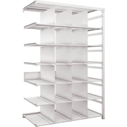 เป็นชั้นเก็บของความหนาแน่นสูงที่ช่วยเพิ่มประสิทธิภาพการจัดเก็บสูงสุดโดยลดความหนาของชั้นวางและคานให้เหลือน้อยที่สุด และทำให้ส่วนล่างด้านหน้าไม่มีคาน แป้งเคลือบสารต้านแบคทีเรียช่วยรักษาความสะอาด (SIAA:JP0122258A0001W) เนื่องจากแผ่นแบ่งพาร์ติชันสามารถเคลื่อนย้ายได้ จึงแบ่งโซนได้ง่ายและป้องกันไม่ให้ผลิตภัณฑ์ปะปนกัน เนื่องจากสามารถปรับตำแหน่งของกระดานชั้นวางได้ในระยะพิทช์ 25 มม. จึงสามารถเปลี่ยนได้อย่างอิสระตามรายการที่จัดเก็บ หากความสูงและความลึกเท่ากัน คุณสามารถเพิ่มได้ นอกจากนี้ยังสามารถลดต้นทุนได้โดยใช้สตรัทเป็นตัวค้ำ มาพร้อมกับฉากกั้นที่เคลื่อนย้ายได้ซึ่งเหมาะสำหรับโกดังที่เก็บกล่องต่างๆ