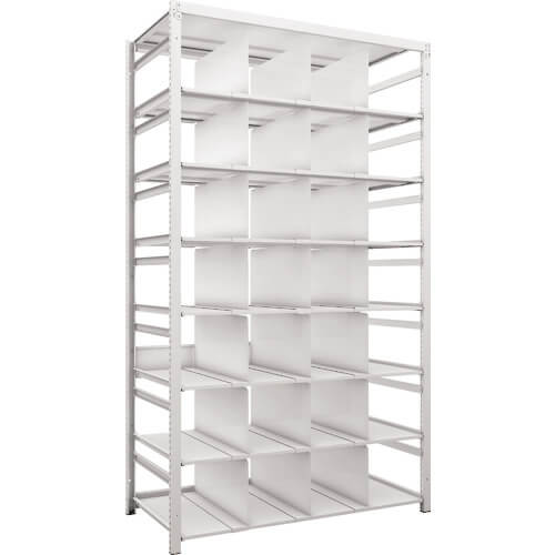 เป็นชั้นเก็บของความหนาแน่นสูงที่ช่วยเพิ่มประสิทธิภาพการจัดเก็บสูงสุดโดยลดความหนาของชั้นวางและคานให้เหลือน้อยที่สุด และทำให้ส่วนล่างด้านหน้าไม่มีคาน แป้งเคลือบสารต้านแบคทีเรียช่วยรักษาความสะอาด (SIAA:JP0122258A0001W) เนื่องจากแผ่นกั้นสามารถเคลื่อนย้ายได้ จึงสามารถแบ่งโซนต่างๆ ได้ง่ายและป้องกันไม่ให้ผลิตภัณฑ์ปะปนกัน เนื่องจากสามารถปรับตำแหน่งของกระดานชั้นวางได้ในระยะพิทช์ 25 มม. จึงสามารถเปลี่ยนได้อย่างอิสระตามรายการที่จัดเก็บ หากความสูงและความลึกเท่ากัน คุณสามารถเพิ่มได้ นอกจากนี้ยังสามารถลดต้นทุนได้โดยใช้สตรัทเป็นตัวค้ำ มาพร้อมกับฉากกั้นที่เคลื่อนย้ายได้ซึ่งเหมาะสำหรับโกดังที่เก็บกล่องต่างๆ