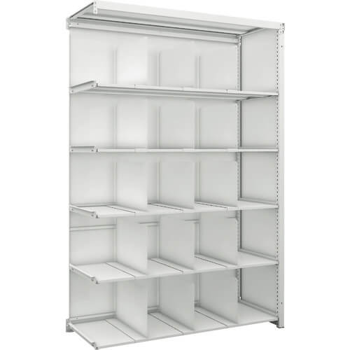 ชั้นเก็บของความหนาแน่นสูงเคลือบสารต้านแบคทีเรียชนิด K1 พร้อมแผ่นหลังและแผงด้านข้าง H1900XW1250XD475 6 ระดับพร้อม 15 พาร์ติชั่นแบบเชื่อมต่อ