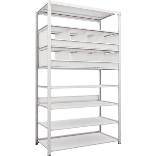 เป็นชั้นเก็บของความหนาแน่นสูงที่ช่วยเพิ่มประสิทธิภาพการจัดเก็บสูงสุดโดยลดความหนาของชั้นวางและคานให้เหลือน้อยที่สุด และทำให้ส่วนล่างด้านหน้าไม่มีคาน แป้งเคลือบสารต้านแบคทีเรียช่วยรักษาความสะอาด (SIAA:JP0122258A0001W) สามารถแบ่งพื้นที่จัดเก็บได้ด้วยถาดแบ่งพาร์ติชั่น ทำให้เหมาะสำหรับการจัดเก็บผลิตภัณฑ์ที่หลากหลายในปริมาณน้อย เนื่องจากสามารถปรับตำแหน่งของกระดานชั้นวางได้ในระยะพิทช์ 25 มม. จึงสามารถเปลี่ยนได้อย่างอิสระตามรายการที่จัดเก็บ หากความสูงและความลึกเท่ากัน คุณสามารถเพิ่มได้ นอกจากนี้ยังสามารถลดต้นทุนได้โดยใช้สตรัทเป็นตัวค้ำ มาพร้อมกับถาดแบ่งสำหรับนำสิ่งของที่แบ่งย่อยออกจากด้านข้างได้อย่างง่ายดาย
