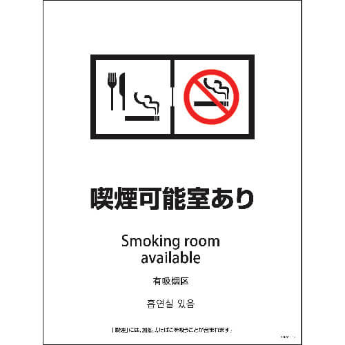 โดยจะเขียนเป็น 4 ภาษา ได้แก่ ญี่ปุ่น อังกฤษ เกาหลี และจีน บังคับใช้วันที่ 1 เมษายน 2563 เป็นป้ายห้องสูบบุหรี่ ซึ่งเป็นไปตาม พ.ร.บ. ส่งเสริมสุขภาพ ฉบับแก้ไข เราจะแจ้งให้ทราบสภาพแวดล้อมของอุปกรณ์