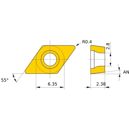 วัสดุชิ้นงานที่เหมาะสม: ชนิด M รูปทรงเม็ดมีด: สี่เหลี่ยมขนมเปียกปูน 55° เส้นผ่านศูนย์กลางวงกลมภายใน (IC) (มม.): 6.35 ความหนา (S) (มม.): 2.38 รัศมีมุม (RE) (มม.): 0.4 การเคลือบผิว: MC7125 |