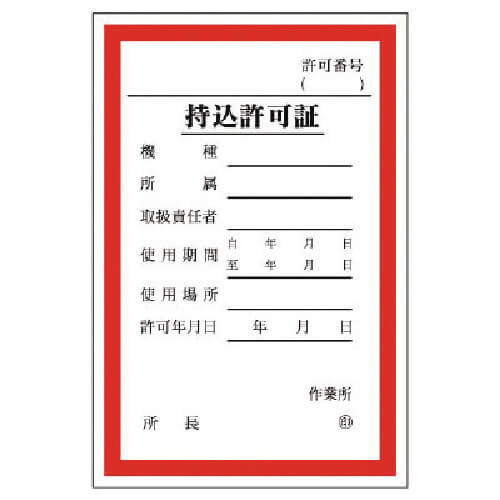 เนื้อหาที่แสดง: ใบอนุญาตพกพา (หมายเลขใบอนุญาต รุ่น แผนก ผู้รับผิดชอบ ระยะเวลาการใช้งาน สถานที่ใช้งาน วันที่อนุญาต สถานที่ทำงาน ผู้อำนวยการ); ความยาว (มม.): 150; ความกว้าง (มม.): 100; ความหนา (มม.): 0.08 คำอธิบาย: กาวซีล |