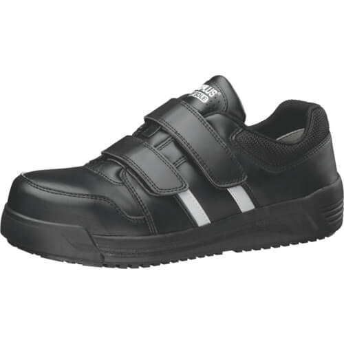 รูปแบบพื้นรองเท้าจัดวางในแนวทแยงเพื่อเสริมการยึดเกาะ ไม่เพียงแต่ด้านหน้าและด้านหลังเท่านั้น แต่ยังรวมถึงด้านข้างและแนวทแยงด้วย มีคุณสมบัติกันลื่นบนวัสดุปูพื้นหลายประเภท เช่น พื้นผิวโลหะแข็ง เช่น ตะแกรง และกระเบื้องที่ไม่เรียบ มาพร้อมกับ เครื่องหมายกันลื่น ที่ระบุว่าเมื่อใดควรเปลี่ยนรองเท้า และแจ้งให้คุณทราบเมื่อฟังก์ชันกันลื่นเสื่อมลงเนื่องจากการสึกหรอของพื้นรองเท้า ใช้กล่องเก็บนิ้วเท้าเรซินแบบกว้างที่สามารถสวมใส่ได้อย่างสบายเมื่อยืดนิ้วหัวแม่มือ ใช้พื้นรองเท้าด้านในแบบคัพต้านเชื้อแบคทีเรียและระงับกลิ่นกาย มาพร้อมวัสดุสะท้อนแสงเหมาะสำหรับการทำงานในที่มืด