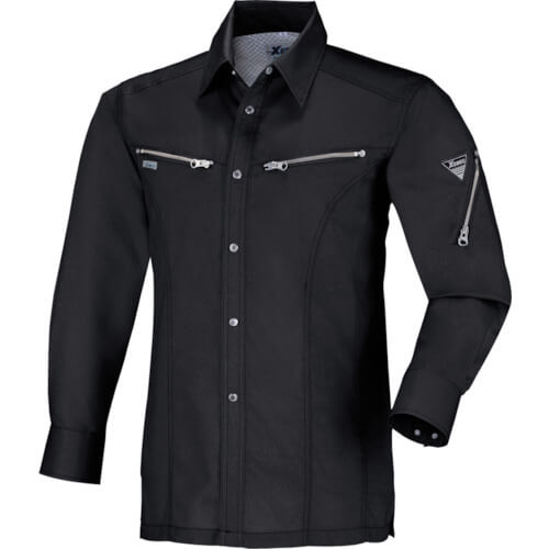 เสื้อเชิ้ตติดกระดุมพร้อมกระดุมโลหะที่สาบเสื้อ ผสานรอยเย็บที่เฉียบคมและตัวยึด ทำให้เป็นชุดทำงานที่มีสไตล์และไร้ความกลัว เป็นสี่สีของการแปรผันของสีที่ตัวเลือกกระจายผ่าน