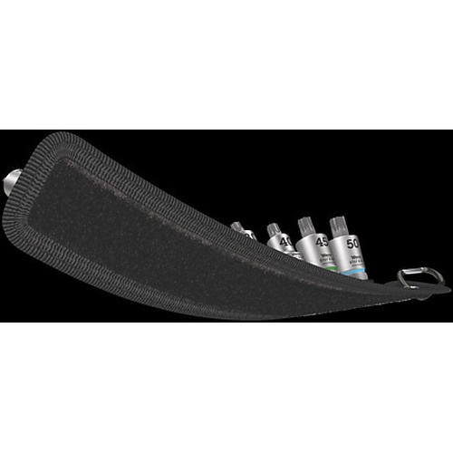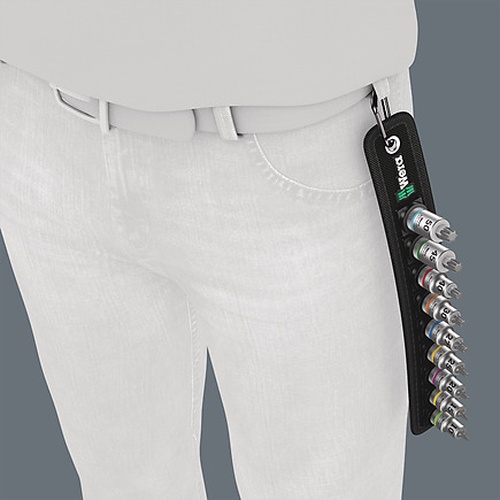 Typically Wera designed robust textile belt with 9 sockets taking up minimal space. A smooth Twist to Unlock mechanism ensures a secure fit and simple removal of the sockets. Comes with Take it easy Tool Finder with colour coding according to size to enable the right tool to be selected easily and quickly. Includes a snap hook for secure fastening to a belt loop or pocket. Especially short, stable bit-sockets with all the advantages of the Wera bit technology. Bit sockets with holding function for particularly convenient screwdriving with reduced risk of losing the screw when approaching the workpiece. Supplied with a nonwoven reverse side and hook and loop strips for simple attachment e.g. to a wall, shelf, tool trolley and to the Wera 2go tool transport system.