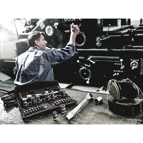 Incredibly compact set arrangement with many tools in a minimum of space. A completely new ratchet set feeling thanks to the unique textile boxes that are very robust and durable. They can be positioned upright for tidy storage on the workshop shelf. Additional surface protection due to textile outer material. Low weight and volume for simpler mobility. Take it easy Tool Finder with colour coding according to sizes.