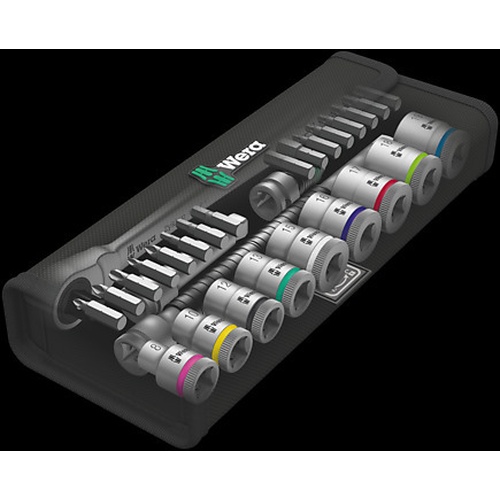 8004 B Zyklop Metal Ratchet with switch lever and 3/8" drive 05004034001 1x 3/8" x 222 mm 8790 HMB Zyklop 3/8" socket 05003553001 1x 8 x 29 mm 05003555001 1x 10 x 29 mm 05003557001 1x 12 x 29 mm 05003558001 1x 13 x 29 mm 05003560001 1x 15 x 29 mm 05003561001 1x 16 x 30 mm 05003562001 1x 17 x 30 mm 05003563001 1x 18 x 30 mm 05003564001 1x 19 x 30 mm 8794 LB Zyklop extension with free-turning sleeve, long, 3/8" 05003583001 1x 3/8" x 200 mm 8794 B Zyklop wobble extension, 3/8" 05003584001 1x 3/8" x 76 mm 8784 B1 Zyklop bit adaptor, 3/8" 05003590001 1x 1/4" x 3/8" x 44 mm 851/1 Z bits 05072070001 1x PH 1 x 25 mm 05072072001 1x PH 2 x 25 mm 05072074001 1x PH 3 x 25 mm 855/1 Z bits 05072080001 1x PZ 1 x 25 mm 05072082001 1x PZ 2 x 25 mm 867/1 TORX® bits 05066486001 1x TX 15 x 25 mm 05066487001 1x TX 20 x 25 mm 05066488001 1x TX 25 x 25 mm 05066489001 1x TX 27 x 25 mm 05066490001 1x TX 30 x 25 mm 05066491001 1x TX 40 x 25 mm 840/1 Z bits 05056315001 1x 3 x 25 mm 05056320001 1x 4 x 25 mm 05056325001 1x 5 x 25 mm 05056330001 1x 6 x 25 mm 05056335001 1x 8 x 25 mm |