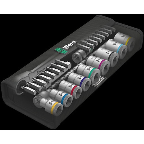 8004 B Zyklop Metal Ratchet with switch lever and 3/8" drive 05004034001 1x 3/8" x 222 mm 8790 HMB Zyklop 3/8" socket 05003569001 1x 1/4" x 29 mm 05003570001 1x 5/16" x 29 mm 05003572001 1x 3/8" x 29 mm 05003573001 1x 7/16" x 29 mm 05003574001 1x 1/2" x 29 mm 05003575001 1x 9/16" x 29 mm 05003576001 1x 5/8" x 30 mm 05003577001 1x 11/16" x 30 mm 05003578001 1x 3/4" x 30 mm 8794 LB Zyklop extension with free-turning sleeve, long, 3/8" 05003583001 1x 3/8" x 200 mm 8794 B Zyklop wobble extension, 3/8" 05003584001 1x 3/8" x 76 mm 8784 B1 Zyklop bit adaptor, 3/8" 05003590001 1x 1/4" x 3/8" x 44 mm 851/1 Z bits 05072070001 1x PH 1 x 25 mm 05072072001 1x PH 2 x 25 mm 05072074001 1x PH 3 x 25 mm 855/1 Z bits 05072080001 1x PZ 1 x 25 mm 05072082001 1x PZ 2 x 25 mm 867/1 TORX® bits 05066486001 1x TX 15 x 25 mm 05066487001 1x TX 20 x 25 mm 05066488001 1x TX 25 x 25 mm 05066489001 1x TX 27 x 25 mm 05066490001 1x TX 30 x 25 mm 05066491001 1x TX 40 x 25 mm 840/1 Z bits 05135074001 1x 5/32" x 25 mm 05135075001 1x 3/16" x 25 mm 05135076001 1x 1/4" x 25 mm 05135077001 1x 5/16" x 25 mm 05135079001 1x 7/32" x 25 mm |