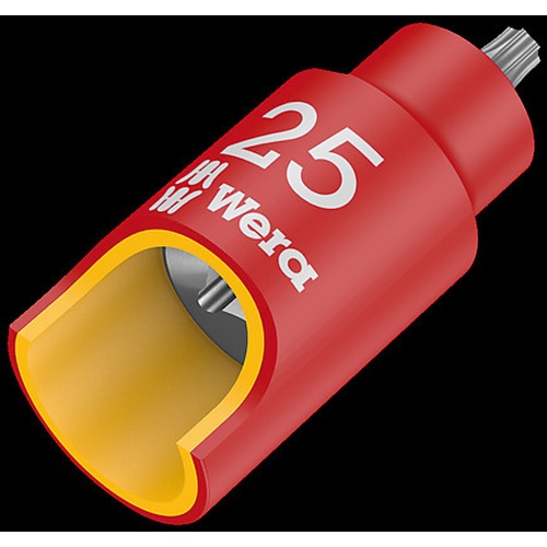 VDE ⅜” bit socket with holding function for particularly comfortable screwdriving with reduced risk of screw loss when feeding to the component. With increased safety due to yellow insulation core, which becomes visible in case of damage to the outer red VDE insulation layer. Individually tested tool as per IEC 60900 at 10,000 V for safe working at the approved voltage of 1,000 V.