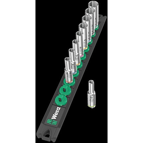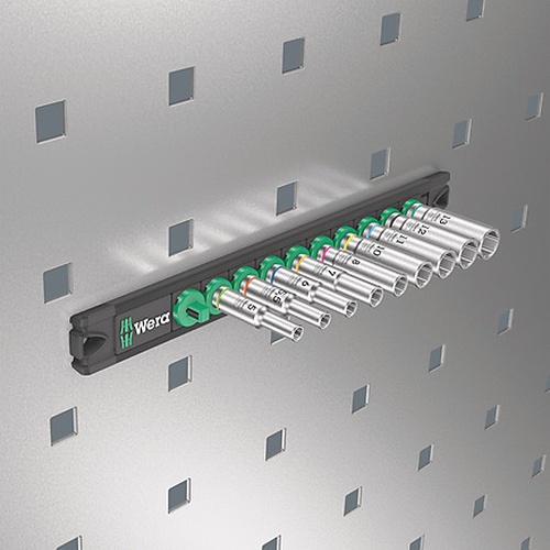 Socket rail with 9 long manual and machine sockets (non-impact), ¼”. A smooth rotary mechanism allows a secure hold and easy access of the sockets. Long ¼” manual and machine sockets (ISO 2725 part 3) by Wera for manual and (non-impact) machine use even at low lying couplings and protruding thread rods. With Take it easy tool finder with colour coding by size – to help you find the required tool quickly and easily. Slip-proof for easy grip even with oily hands. With hexagon profile and ball stop groove. The hexagon profile enables the transmission of high forces and loads the edges of the bolt or the screw head less than a double hexagon profile. Fine-teethed ratchets also make use of a double hexagon profile superfluous, even in confined spaces, thanks to their small return angle. For external hexagon bolts and screws. The rail allows temporary attachment to metallic surfaces and, with its twist-to-unlock function, ensures secure locking and unlocking of the sockets.