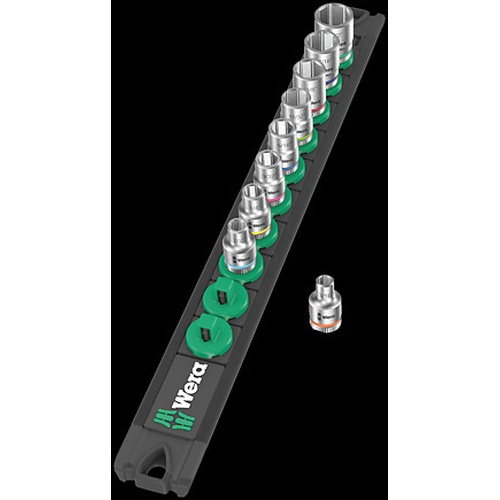 Socket rail with 9 manual and machine sockets (non-impact), 1/4″. A smooth rotary mechanism allows a secure hold and easy access of the sockets. With Take it easy tool finder with colour coding by size – to help you find the required tool quickly and easily. The rail allows temporary attachment to metallic surfaces and, with its twist-to-unlock function, ensures secure locking and unlocking of the sockets.