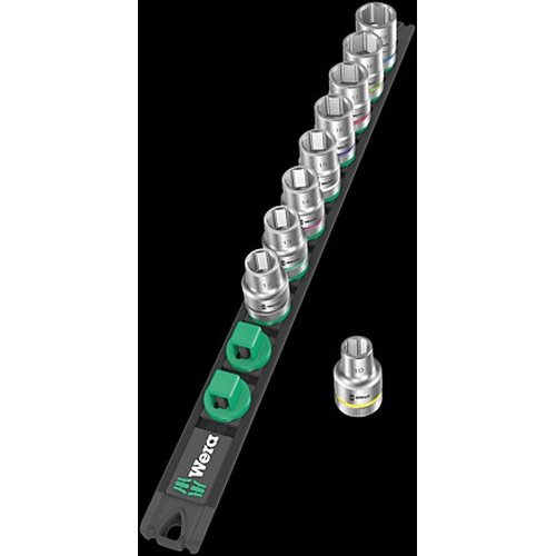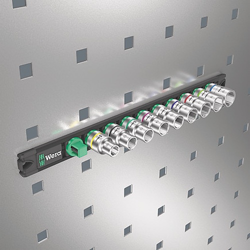 Socket rail with 9 manual and machine sockets (non-impact), 1/2″. A smooth rotary mechanism allows a secure hold and easy access of the sockets. With Take it easy tool finder with colour coding by size – to help you find the required tool quickly and easily. The rail allows temporary attachment to metallic surfaces and, with its twist-to-unlock function, ensures secure locking and unlocking of the sockets.