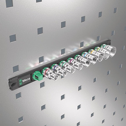 Socket rail with 9 manual and machine sockets (non-impact), 1/2″. A smooth rotary mechanism allows a secure hold and easy access of the sockets. With Take it easy tool finder with colour coding by size – to help you find the required tool quickly and easily. The rail allows temporary attachment to metallic surfaces and, with its twist-to-unlock function, ensures secure locking and unlocking of the sockets.