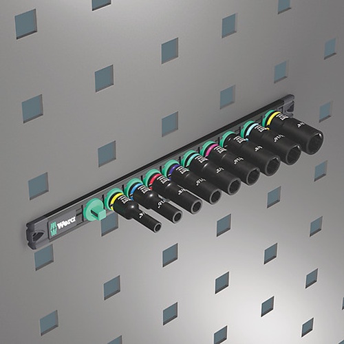 Socket rail with 9 long Impaktor sockets, 3/8″. The Impaktor technology ensures higher-than-average service life even at extreme requirements. Long design to work even on low-lying couplings and protruding thread rods. The hexagon profile offers the transmission of high forces and loads the edges of the bolt or the screw head less than a double hexagon profile. With Take it easy tool finder with colour coding by size – for quick and easy identification of the required tool. The rail allows temporary attachment to metallic surfaces and, with its twist-to-unlock function, ensures secure locking and unlocking of the sockets.