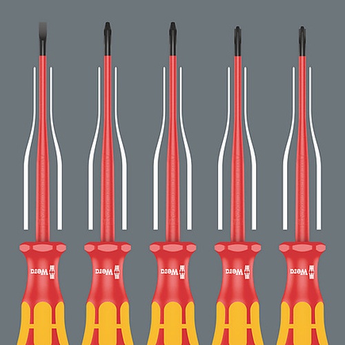 Wera VDE screwdriver with multi-component Kraftform Plus handle for fast and smooth work: Hard handle zones for high working speeds, while soft handle zones guarantee a high torque transfer. Individually tested at 10,000 V for safe working at the approved voltage of 1,000 V. Reduced blade diameter, so that even sunken screws can be easily reached. Take it easy tool finder with colour coding by profile and size stamping – for quick and easy identification of the required tool. the hexagon anti-roll protection avoids screwdrivers from rolling away annoyingly at the workplace.