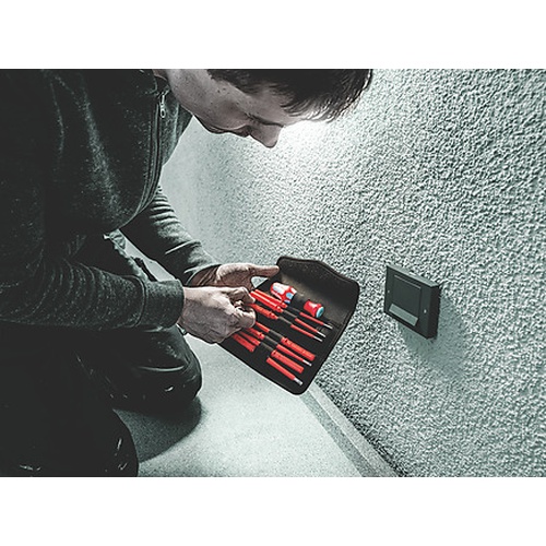 2 VDE-insulated Kraftform 3817 VDE bladeholding screwdrivers with anti-roll protection VDE blades (157 mm length) with practical spinning function, anti-roll protection and Take it easy tool finder: colour coding by profile and laser-engraved size indication Blades made of stainless steel to prevent extraneous rust Individually tested VDE Stainless blades, some of which with reduced blade diameter Vacuum ice-hardening provides the required hardness and strength Individually tested tools as per IEC 60900 at 10,000 V In a robust folding pouch Compatible with Wera 2go |