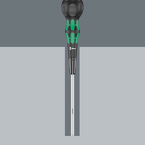 Screwdriver with Kraftform series 1800 handle for slotted screws. The handle fits perfectly in the hand. The convex shape allows the transmission of high torques. The soft handle zones ensure a good grip and low-loss power transmission. The hard handle zones allow a high power transmission, even when pressure is applied with the ball of the hand. The recesses at the upper end of the handle facilitate fine adjustment while screwdriving. Due to the narrow transition between handle and blade, even sunken screws in narrow areas can be easily reached. The anti-roll protection at the rear end of the handle hinders the tool from rolling away annoyingly at the workplace. The tips of Wera Lasertip screwdrivers are microscopically roughened with laser beams. This rough surface “bites” into the screw head which avoids unintentional slipping out of the screw.
