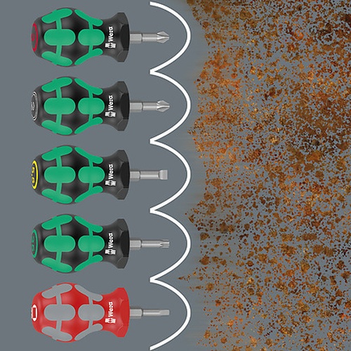 Particularly small screwdriver with short blade for hard-to-reach areas. The 2-component Kraftform handle with its handy combination of hard and soft zones allows for a firm grip and precise working. The blades have all the advantages of the Wera bit technology. Special surface treatment of the blades for high corrosion protection and optimum fitting accuracy in the screw. The hexagon anti-roll protection avoids screwdrivers from rolling away annoyingly at the workplace.