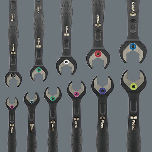 11-piece ring ratchet spanner set by Wera. For hexagon screw heads and bolts. With holding function enabled by a metal plate in the mouth, which reduces the risk of losing screws and sockets. With its extra hard teeth, the exchangeable metal plate in the mouth secures screws and sockets and reduces the risk of slipping. The integrated end stop can prevent the screw head from slipping down and allows application of high torques. The double hexagon geometry ensures a positive connection with the screw or bolt and thus reduces the risk of slipping. A return angle of only 30° at the jaw end avoids time-consuming rotating of the tool whilst screwdriving. With its exceptionally high fine toothing of 80 teeth, the ratchet mechanism at the ring side offers flexibility even in confined spaces. The specially engineered geometry allows high torque transmission and high bending stiffness. Made of high-performance chromium molybdenum steel with a high-quality, robust matte-black chrome-plated surface. With Take it easy tool finder: colour coding by size. In a robust roll pouch.