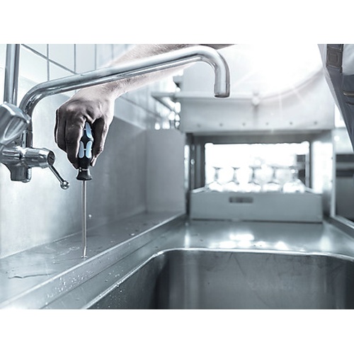 High quality Kraftform Plus screwdriver out of stainless steel. The stainless tools from Wera are vacuum ice-hardened and have the hardness and strength needed for screw connections. They can be used for industrial application without hesitation. The Lasertip tip literally bites into the head of the screw and thereby prevents any slipping out of the screw head. Multi-component Kraftform handle for fast and low-fatigue working. Take it easy Tool Finder: colour coding according to profile and size. The hexagonal anti-roll feature prevents any bothersome rolling away at the workplace.