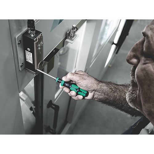 Bitholding screwdriver with Rapidaptor quick-release chuck for bits with 1/4" external hexagon drive as per DIN ISO 1173-C 6.3 and E 6.3 and Wera series 1 and 4 Ratchet mechanism integrated in the handle The integrated ratchet with fine toothing ensures fast and safe working High working speed: The ratchet mechanism allows to "spin" when screwdriving Ergonomic intuitive switching to clockwise/counterclockwise or position 0 Rapidaptor holder for rapid bit change For bits with 1/4" external hexagon drive as per DIN ISO 1173-C 6.3 and E 6.3 Multi-component Kraftform handle for fast and ergonomic screwdriving In a robust folding pouch with Wera 2go compatibility |