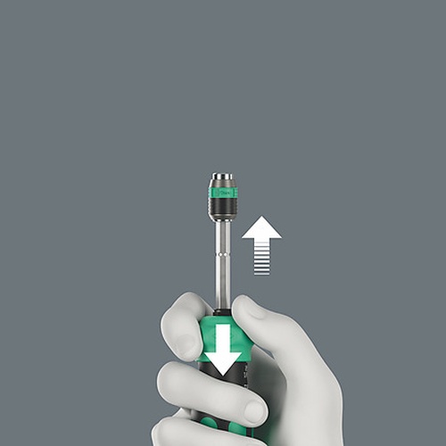 Kraftform handle with magazine for 6 bits integrated in the handle; with telescopic blade; for 1/4″ hex drive bits. The ratchet with fine toothing integrated in the handle allows fast working. Switching the screwdriving direction is intuitive: Turn the ring switch clockwise for clockwise screwdriving, turn it counterclockwise for counterclockwise screwdriving. Use position 0 to deactivate the ratchet mechanism for precise working. The telescopic blade with Rapidaptor quick-release chuck, which can be retracted into the handle, allows quick manual screwdriving even in confined working situations when the blade is retracted. The blade can be extended by simply pressing the locking sleeve. The tool can now be used as a fully-fledged screwdriver. The telescopic blade can be removed and used as a machine adapter, as well as returned to its original position. The Rapidaptor technology of the bit holder makes for a quick bit change. Includes 6 BiTorsion bits for long product life, tough, for universal use; stored in the bit magazine integrated in the handle. The strong permanent magnet in the 1/4″ bit mounting ensures a secure hold of the bit. The 2-component Kraftform handle with the combination of hard and soft zones allows for a firm grip and precise working. With a robust pouch.