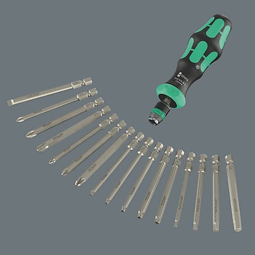 The ratchet with fine toothing integrated in the handle allows fast working The innovative ratchet mechanism also allows fast "spinning". A real problem solver when there is no resistance from the screw Intuitive switching: If I turn the switch clockwise - the ratchet turns clockwise, if I turn the switch counterclockwise - it goes counterclockwise Use position 0 to deactivate the ratchet mechanism for precise working Innovative Rapidaptor technology for a quick bit change 16 bits, 89 mm long, for Phillips-head (Phillips, Pozidriv), TORX® BO, hexagonal socket and slotted In a robust folding pouch with Wera 2go compatibility |