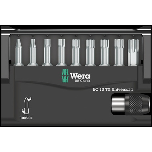Robust Bit-Check by Wera. Bit-Checks provide a quick overview of the tools available. Bits not needed are simply reinserted into the set and do not get lost. Simple transportation e.g. in the shirt pocket. Includes universal holder with quick-release chuck. For the take-up of bits with ¼” hexagon head drive as per DIN ISO 1173-C 6.3. Can be inserted in the power screwdriver or for use in the chuck of the electric drill. Comes with tough viscous TORX® bits for universal use.