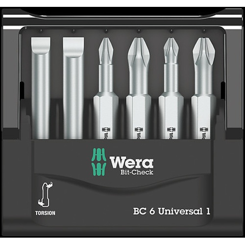 6 50 mm-long Wera bits tidily arranged in a minimum of space in a practical Bit-Check. The tough viscous bits are suitable for universal use. In the case of the Torsion bits (TZ), torque peaks are additionally absorbed in the Torsion zone. This prevents premature wear and enhances the service life.