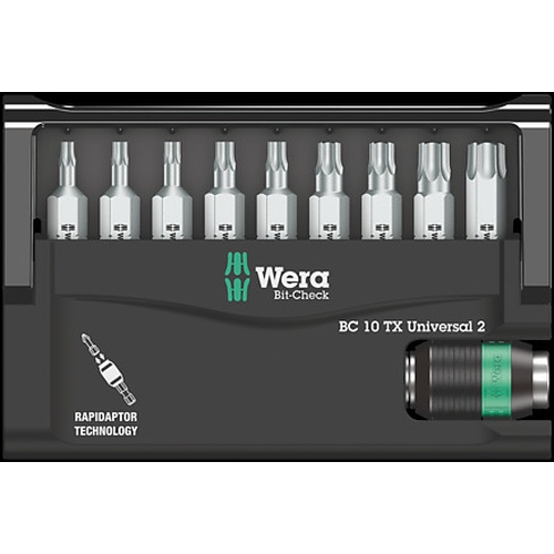 Robust Bit-Check by Wera. Bit-Checks provide a quick overview of the tools available. Bits not needed are simply reinserted into the set and do not get lost. Simple transportation e.g. in the shirt pocket. Includes universal holder with quick-release chuck: the Rapidaptor technology allows bits to be attached without any need to actuate the sleeve. The removal of the bit is simple, just by pushing the sleeve forward – for rapid bit change with just one hand. For the take-up of bits with ¼” hexagon head drive as per DIN ISO 1173-C 6.3. Can be inserted in the power screwdriver or for use in the chuck of the electric drill. Comes with tough viscous TORX® bits for universal use.
