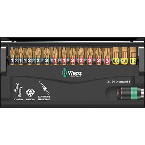 | หม่วดหมู่แบรนด์ | WERA Features Take it easy Rapidaptor BiTorsion Diamond coating Profiles External Hexagon Slotted Phillips Pozidriv Hexagon TORX® Bits, Holders, Adaptors and sets Bit Sets Bit-Checks Diamond |