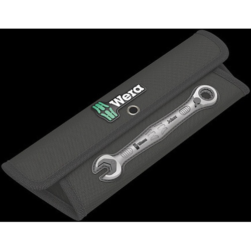 High quality combination ratchet wrench set by Wera: everything that a wrench has to be able to do. And a whole lot more. Faster, better, stylish. Yes, a real Joker. The new generation of combination ratchet wrenches. 4-piece set in a robust pouch. Suitable for hexagon bolt heads or nuts. Comes with a holding function, thanks to the metal plate in the jaw, which reduces the risk of dropping nuts and bolts. The replaceable metal plate in the jaw secures nuts and bolts with its extra hard teeth and limits the danger of slipping. The integrated limit stop prevents any slipping down around the bolt head and allows higher torque to be applied. The double-hex geometry makes for a positive connection with nuts or bolts and reduces the risk of slipping. A return angle of only 30° at the open end prevents any time consuming flipping of the wrench during fastening jobs. The ratchet mechanism at the ring end, with an exceptional, fine-tooth mechanism – 80 teeth in all – enables flexibility even in very confined working spaces. The specially forged geometry provides for high torque transfer and strength. Manufactured out of high performance chrome molybdenum steel with a nickel-chrome coating for high corrosion protection. Take it easy Tool Finder with colour coding according to sizes