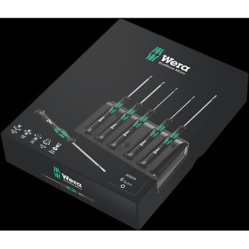 High quality Wera Micro screwdriver set for precision mechanical work. Ballpoint profile: the ballpoint drive profile means that it is possible to swivel the tool axis away from the screwdriving axis, thus enabling “round the corner” screwdriving. Rapid twisting is possible by fixing the hand on the twist cap and using the fast-turning zone just below it. This makes time-consuming grip adjustments unnecessary. Power zone with integrated soft zones ensure the transfer of higher tightening and loosening torque. Precision zone for the right angle for adjustment work. The Wera Black Point tip offers high corrosion protection and an exact fit.