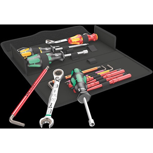 Compact tool set with 15 important screwdriving tools for the sanitary and heating sectors. With 2 Joker Switch ratcheting combination wrenches, VDE handle with 4 extra-slim blades, voltage tester, 4 L-keys with thermoplastic sleeve, chiseldriver and 2 Kraftform Plus nutspinners with hollow shaft. The details: 2 Joker Switch ratcheting combination wrenches with special retaining plate to prevent slipping/loss of the screw and more torque transfer; one Kraftform 817 VDE bladeholding screwdriver solely for Wera VDE blades; 4 VDE blades (each 157 mm length) with Take it easy tool finder with colour coding by profile and laser-engraved size indication; for safe working at up to 1000 volts (iS with reduced blade diameter and integrated protective insulation for reaching and operating low-lying screw and spring elements); 1 single-pole phase tester 247; 4 L-keys with Hex-Plus profile to prevent rounding out screws; 1 Kraftform chiseldriver 932 A (slotted) with pound-thru hexagonal blade and integrated impact cap for screwdriving and light chiselling; 2 socket wrench nutspinners 395 HO with hollow shaft for tightening or loosening nuts on protruding threaded rods as well as fixed screws. Including tools with Take it easy tool finder with colour coding in accordance to profiles and size stamping – for fast and easy tool selection.