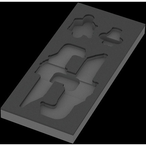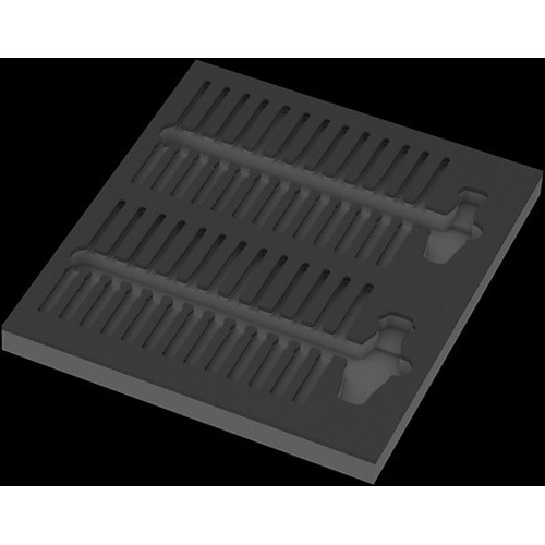 One durable foam insert, without tools; two-coloured for quick identification of missing parts; width x height x depth: 172 x 30 x 392 mm; spare foam insert for Wera item 9720; suitable for the Tool Rebel roller cabinet.