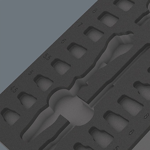 One durable foam insert, without tools; two-coloured for quick identification of missing parts; width x height x depth: 172 x 30 x 392 mm; spare foam insert for Wera item 9720; suitable for the Tool Rebel roller cabinet.