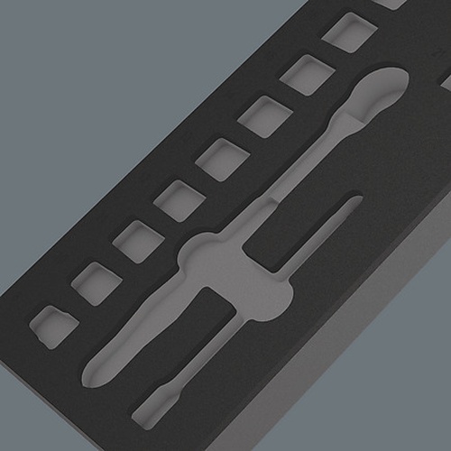 One durable foam insert, without tools; two-coloured for quick identification of missing parts; width x height x depth: 172 x 30 x 392 mm; spare foam insert for Wera item 9724; suitable for the Tool Rebel roller cabinet.