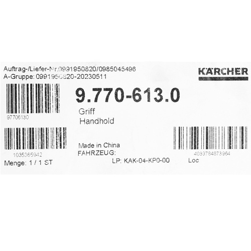 | ใช้เป็นรหัสเคลมอะไหล KARCHER |