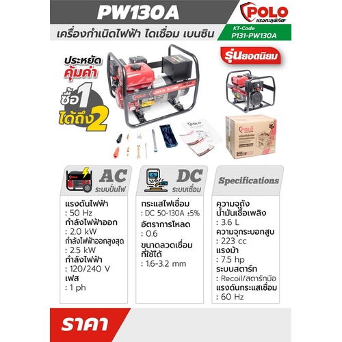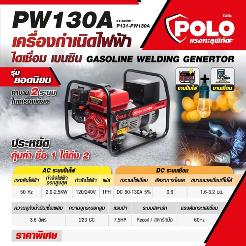 เครื่องปั่นไฟเชื่อม POLO แรงดันไฟ 220 โวลต์ รุ่น PW130A