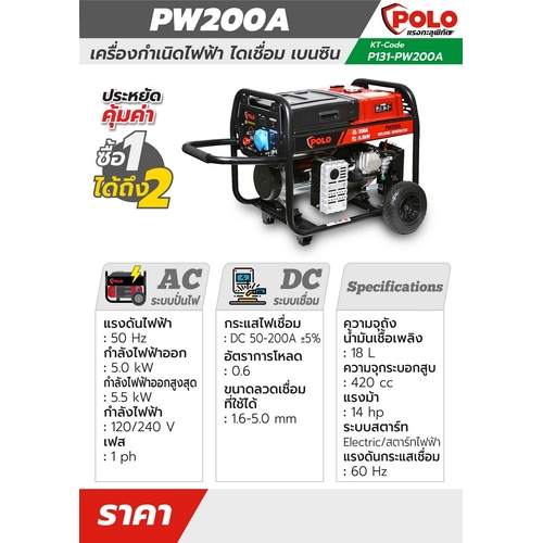 เครื่องปั่นไฟเชื่อม POLO แรงดันไฟ 220 โวลต์ รุ่น PW200A
