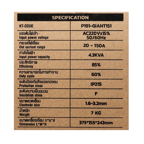 • กระแสไฟเชื่อม : 20 – 150 แอมป์