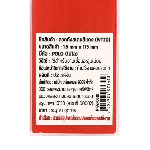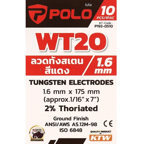 POLO ลวดทังสเตนสีแดง 1.6 X 175 มม. 2% Thoriated (WT20) บรรจุ 10 ชิ้น/แพ็ค
