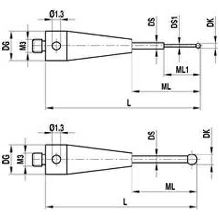 M3 Ø1.5 mm ruby ball, tungsten carbide stem, L 30 mm, ML 22.5 mm, for Zeiss applications
